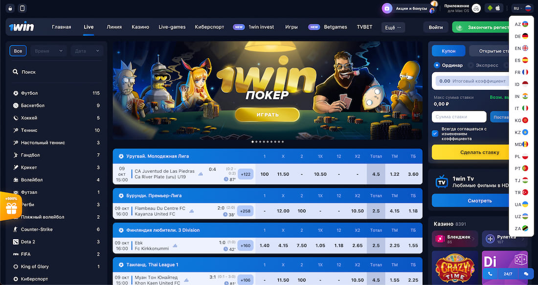 1winrupromoЗнакомство с букмекерской конторой 1вин начинается сайтом, с хорошо продуманным интерфейсом, который представлен в темной цветовой гамме. Первое, что видит пользователь – это информационные баннеры, которые информируют о главных бонусах за регистрацию, кэшбэке и возможности игры в покер. Сайт поддерживает множество языков, включая 22 языка от основных европейских до азиатских. Перемещение по основным разделам сайта осуществляется через строку сверху, в которой более 20 опций.